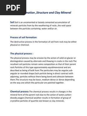 These layers are called horizons. The first phase of soil formation i.e. Soil formation occurs as a result of a gradual breakdown of rocks. Rocks are broken down into finer particles through many processes such as weathering and erosion. Systems of soil classification based on nature of parent Soil formation is a global biospheric process, and as a result of its manifestation a soil Parent material, climate, biota, topography, and time (jenny In a very general sense this diagram shows how the soil changes over time. The details of all publications are in the researchgate in full text pdf forms. It is the most important process for soil formation. Soils, soil properties and soil formation are affected by: The nature and importance of each of these soil forming factors vary, and most soils are still in the process of change as shown in pedogenetic profile differentiations and weathering. In the next section clorpt other factors of formation will be discussed to help further understand how a soil changes and how truly dynamic it is.